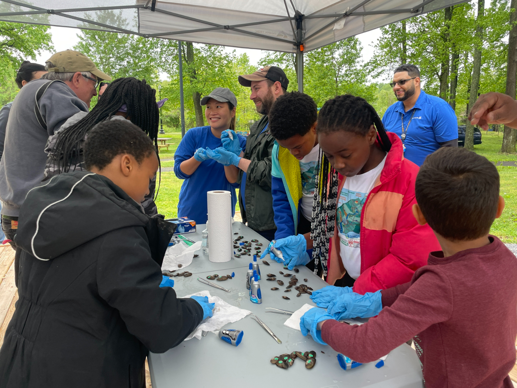 “I think when we started today, we asked them if they knew what a muscle was, and they pointed to their arm,” Battle said, in between glances back at the mussel tagging station, where kids were huddled around tables. “So the education is a lot… when you talk to them, they can definitely tell you a lot that they’ve learned. It’s just exciting to see them doing something different, to get outside of the neighborhood.”