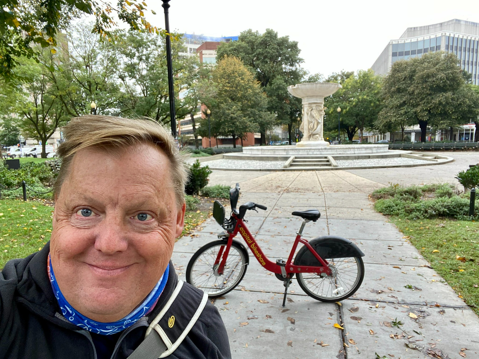 “I was out having coffee and I saw on Twitter that they had snuck into D.C. without telling anyone,” Flood, 56, tells DCist/WAMU. “When I got to the Washington Monument, they were all lined up neatly in this line, listening to the their leader give a speech. And I thought I should just roll right down the line on a Bikeshare and yell at them. I felt like I had a duty to yell at them.”