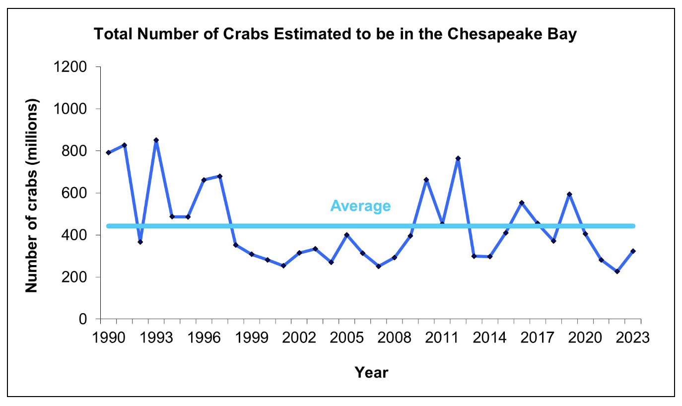 The latest winter blue crab dredge survey, conducted jointly by Maryland and Virginia, was released today, and shows there are an estimated 323 million crabs living in the bay, a 42% increase over last year.