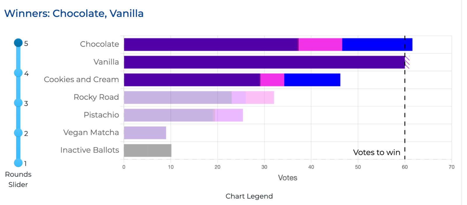 El primer paso de los funcionarios electorales en la tabulación de los votos es contar todos los votos de primera opción. Si ningún candidato recibe el número de votos requerido para alcanzar el porcentaje necesario para ganar, el candidato con menos votos es eliminado. Las papeletas con el candidato de primera opción eliminado contarán entonces con el candidato de segunda opción.