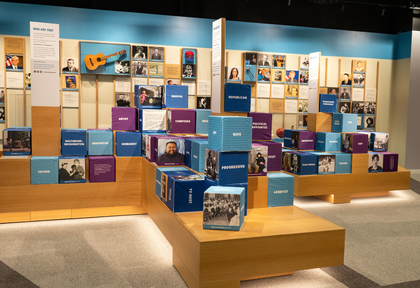 An ongoing exhibit on the first floor begins with the story of the first Jewish family to move to D.C. in 1790 and asks, “What is Jewish Washington?” That question comes back into play in a later section, where soft cubes feature photos of influential Jewish people who have lived or currently live nearby — like D.C.-born, African American, Jewish food writer Michael Twitty — and words describing pieces of their identity on each side.