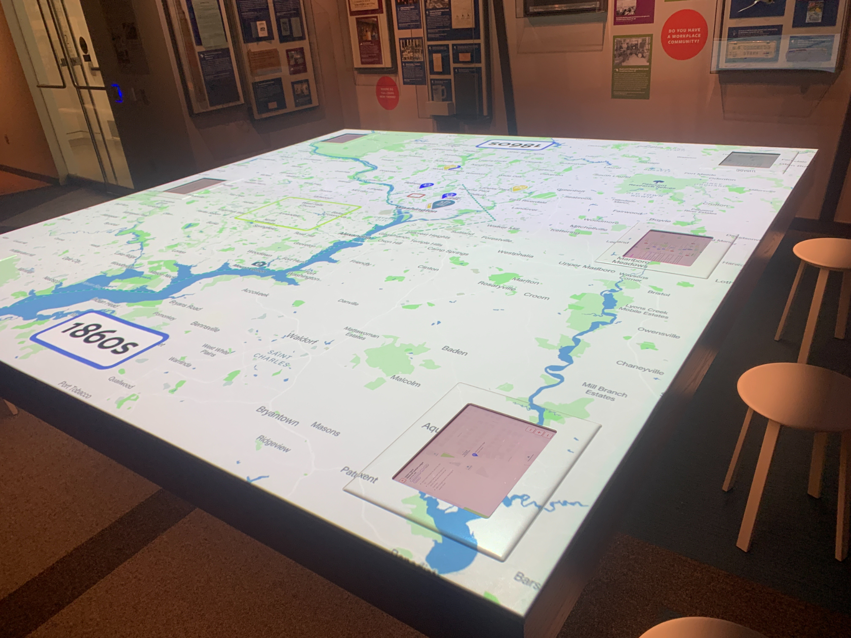 That ceremony dedicated the red-brick synagogue-turned-museum, which still has some of its original pews and fixtures — though it also now has air conditioning and a video projection that explores the history of the congregation. Visitors cross back into the new building via the bridge over the lobby — and across time — to find an exhibit where guests can sit at a modern Seder table with video projections or explore the Jewish community’s expansion throughout the D.C. region, as shown on a massive digital map.