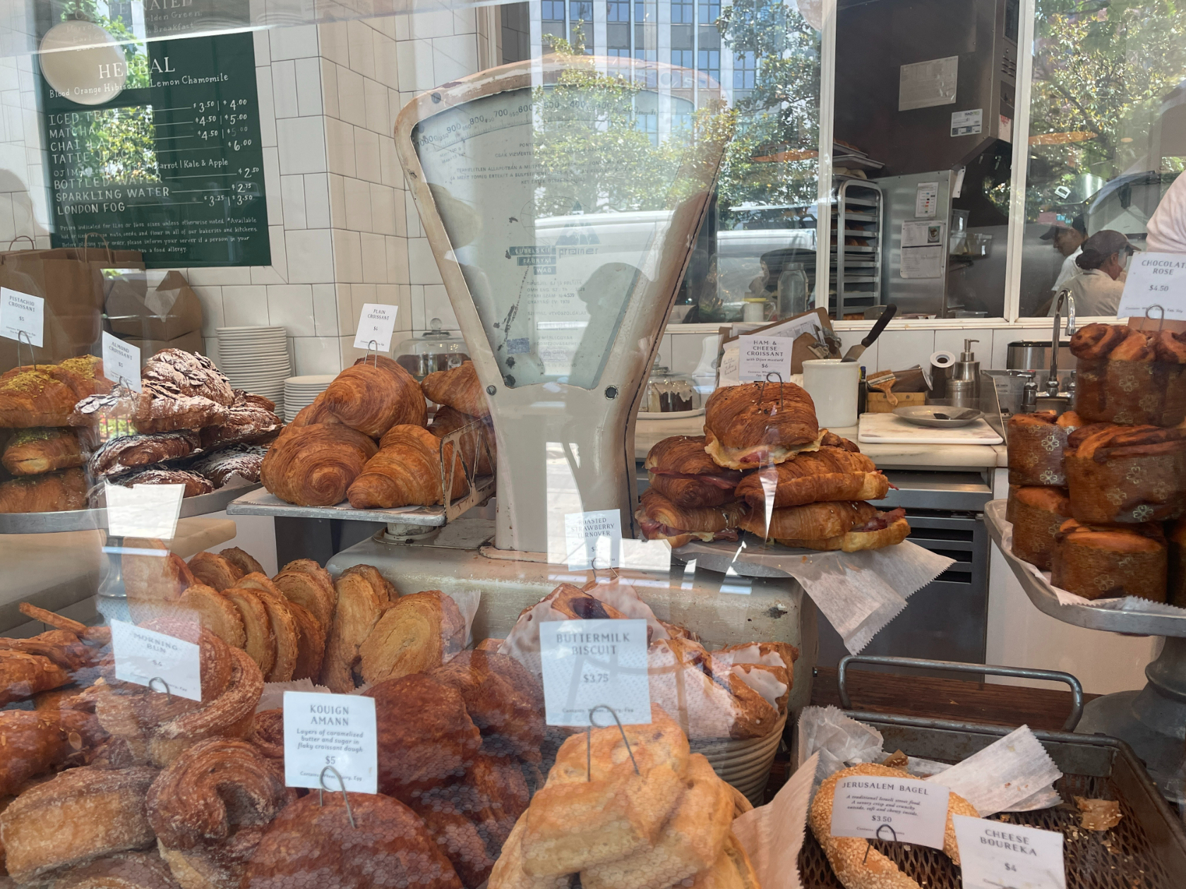 As I am scanning the menu, a middle-aged man in a dry-fit exercise shirt with sunglasses hung around his neck (maybe just back from a run) joins the line behind me, and looks longingly at the lavish pastry display before us, containing but not limited to: tea cakes, croissants, kouign-amann, morning buns, danishes, palmiers, cheese bourekas, and turnovers.