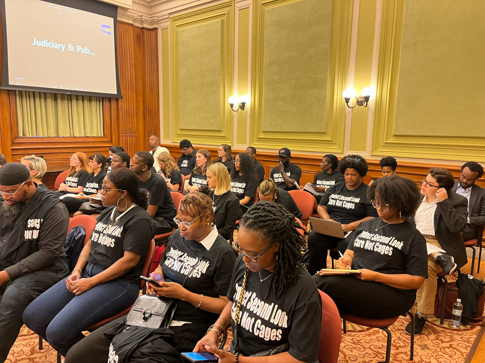 About 165 residents signed up to testify either via Zoom or in-person at the hearing, which was expected to run late into Tuesday evening. They represented a broad range of perspectives, including reform-focused advocacy groups, churches, business leaders, ANC commissioners, crime victims and survivors, and formerly incarcerated residents. Former D.C. Mayor Tony Williams signed up to testify. So did Hilary Cairns, the former director of D.C.’s juvenile justice agency. A collection of formerly incarcerated residents and other advocates packed the hearing room at the Wilson Building wearing matching shirts with the words “Protect Second Look. Care Not Cages” to demonstrate their opposition to the bill.
