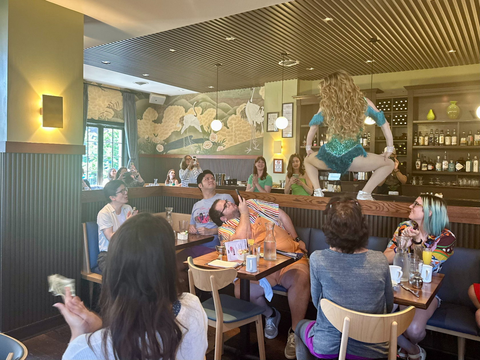 Harlow also values Perry’s for featuring transgender drag performers, given that drag has often centered cis gay men performers. All of Sunday’s drag queens are trans women: India Larelle Houston, Sophia Carrero, Gigi Paris Couture, and Whitney Gucci Goo. Harlow was especially impressed by Larelle Houston, who masterfully emceed the event and made everyone feel welcomed, including by inviting people who were there to celebrate their birthday, wedding, and pregnancy onto the stage to collect their own dollar bills from the audience.