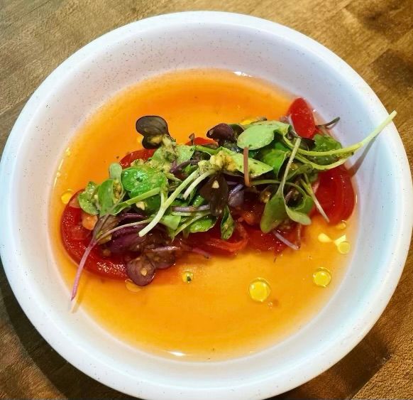 Morishita says she likes to change the restaurant’s specials every week, usually based on a recipe that comes to her at night. One that she’s especially excited to add to the menu is a tomato salad, which is made from compressed tomatoes with dashi, sake, mirin, among other sweet, acidic ingredients. It’s served with pea shoots and pickled red onions.