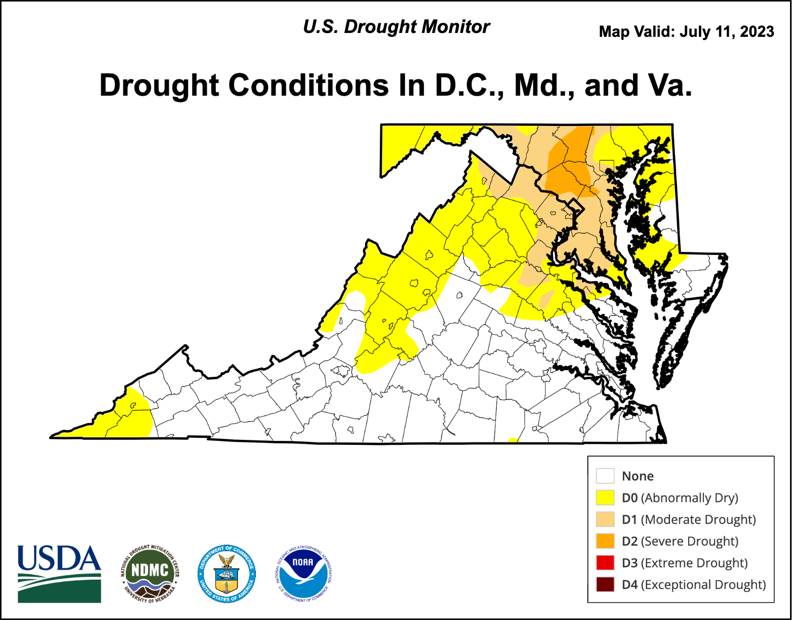 However, the latest data from the U.S. Drought Monitor, released this morning, shows the region is still experiencing drought conditions. Most of Northern Virginia, including Arlington County, Fairfax County, and Loudoun county are in a moderate drought, as is the District. In Maryland, parts of Montgomery County, Prince George’s County, Howard County, and Anne Arundel County are still in severe drought — the only places on the East Coast in that category, except for a handful of counties in Florida.