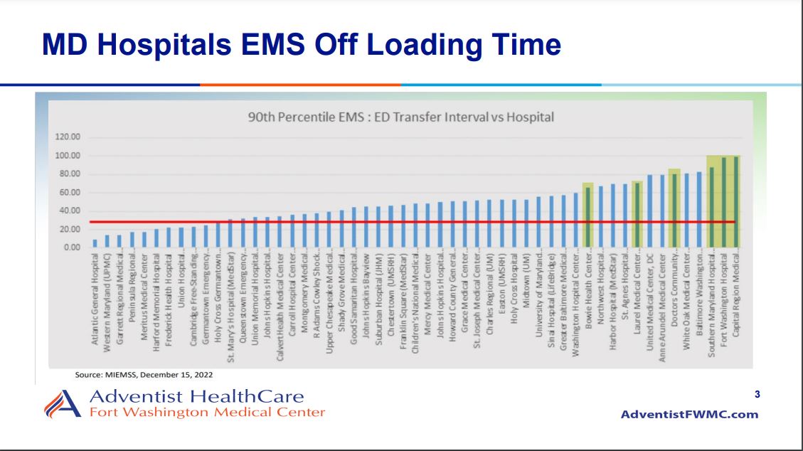 “When it first began in Prince George’s County, there would be occasional times where we had to wait an hour for a patient bed to become available,” said the Vice President of the Prince George’s County Professional Firefighters and Paramedics Association, Grant Walker. “It’s a regular occurrence for our ambulances to wait 2 to 3 hours with a patient in the emergency department, and in some extreme circumstances, [fire and EMS] crews have waited almost an entire 24-hour shift to be relieved.”