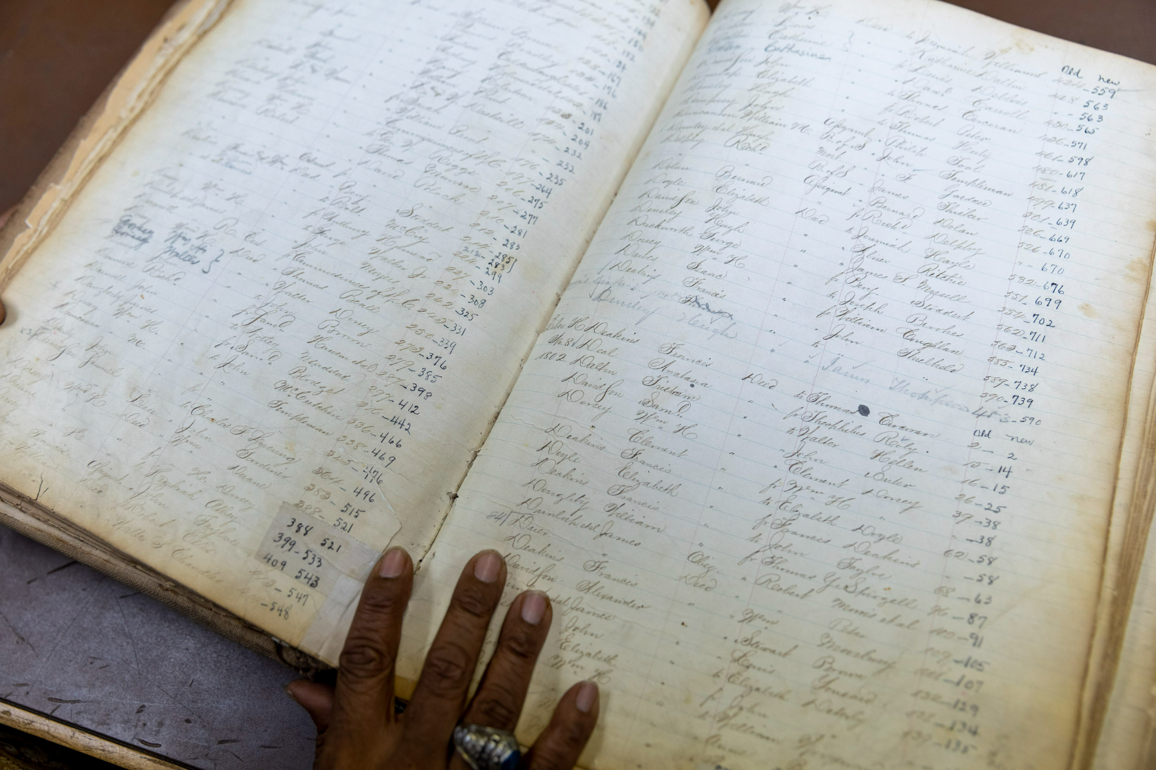 Dr. Lopez Matthews, Jr. traces his finger along a yellowing page in an oversized book. He reads a header written in ornate script, standing above columns containing names and dates.