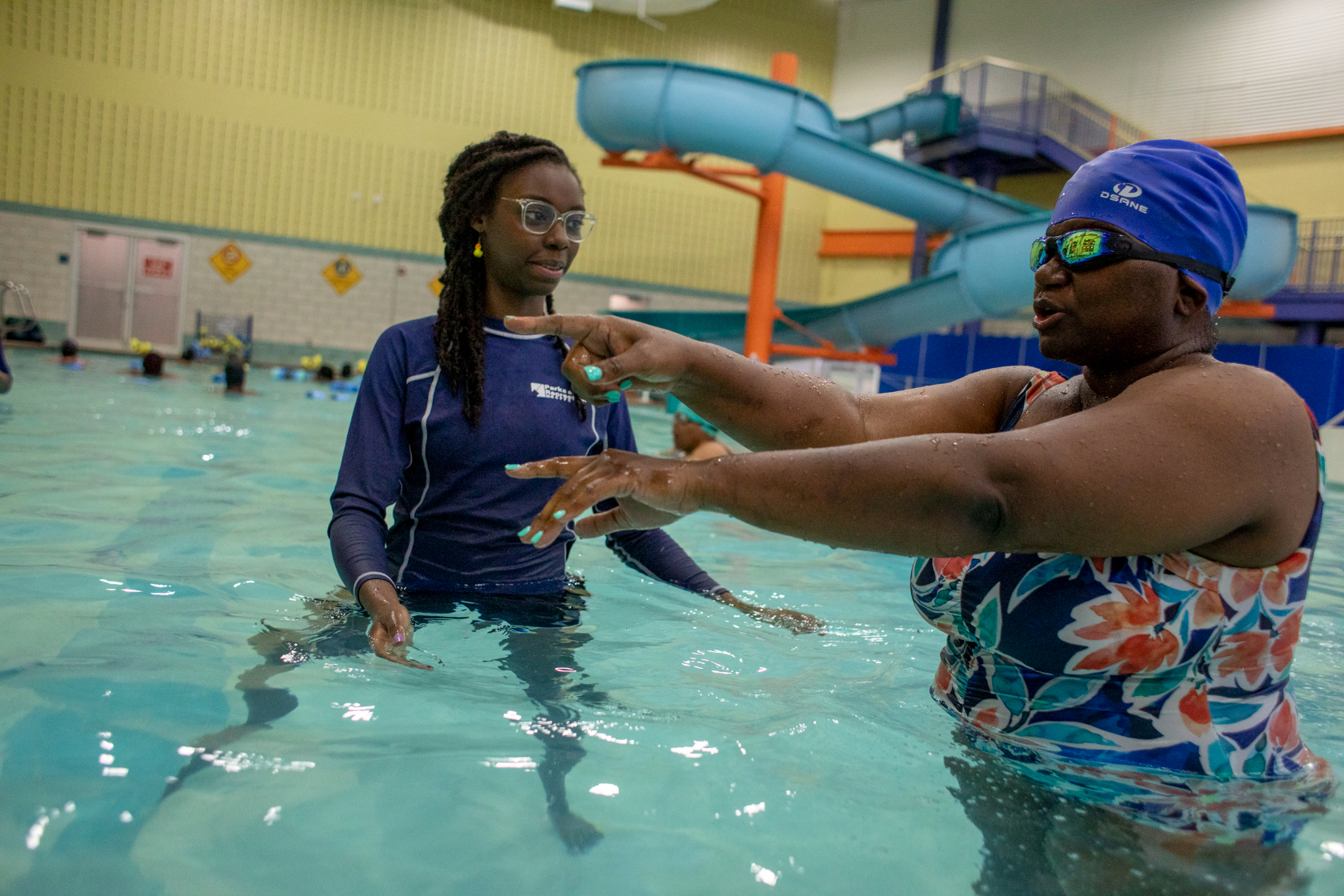 Monica Osborne floats and paddles around the blue water of a pool at the Prince George’s County Sports and Learning Complex in Largo, listening intently to swim instructor Marlon Turner. Clad in a blue leaf-patterned swimsuit and swim cap, she tentatively puts her head under water, then asks Turner for feedback on how to improve on blowing bubbles, the focus of Turner’s lesson for the day.