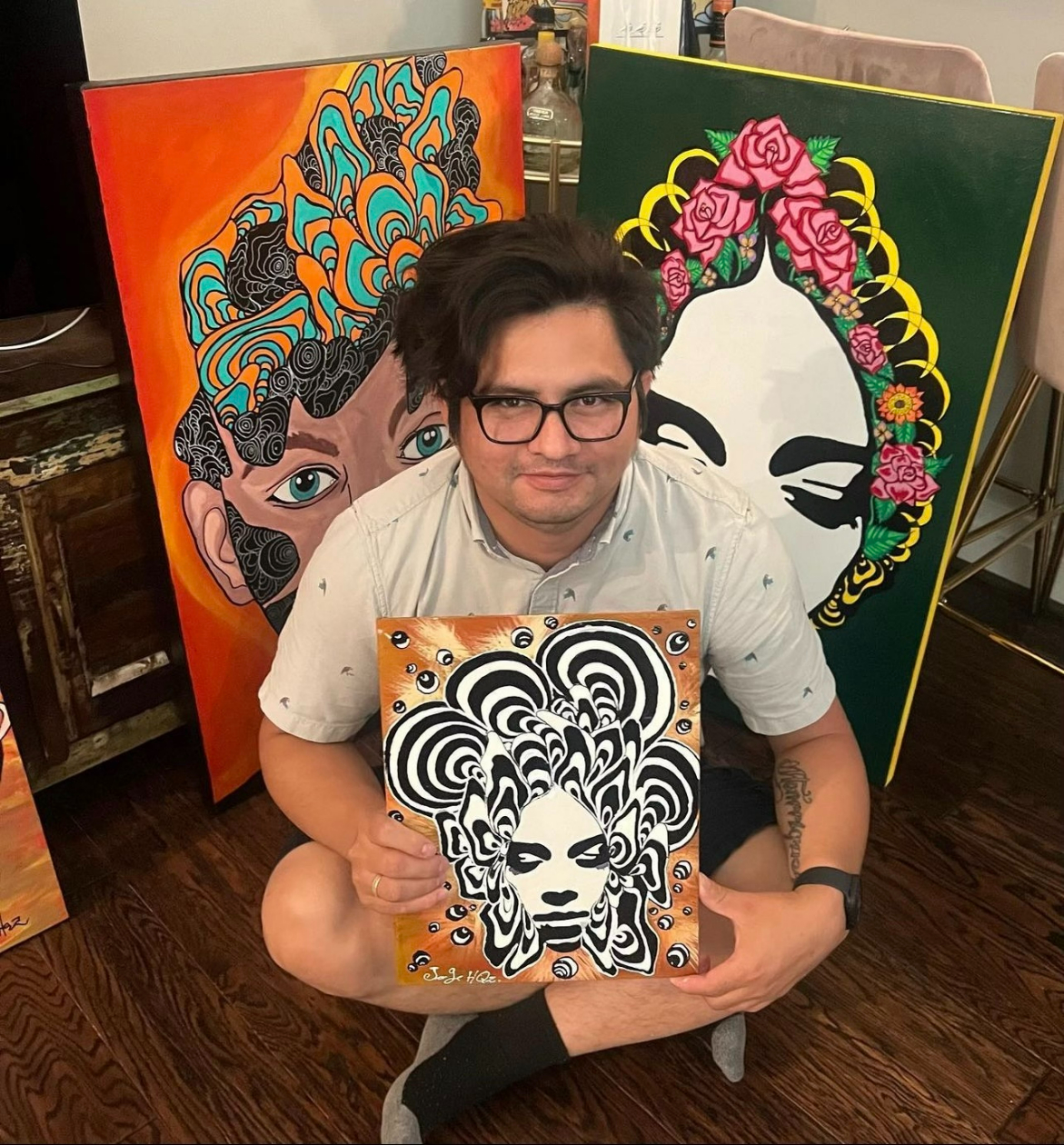What works are you currently displaying at WallMountables? I initially installed a work called Synesthesia 1 and another called Cara 3: El Principito Moreno (Face 3: The Brown Prince) at the beginning of July. However, Synesthesia 1 sold through another platform and I replaced it with a third painting, Aura. [I painted Aura] after being inspired by the colors and visualizations I experienced while meditating during the pandemic. Cara 3: El Principito Moreno (Face 3: The Brown Prince) is the third in a series of semi-abstract portraits that coincidentally ended up resembling the late musician, Prince.