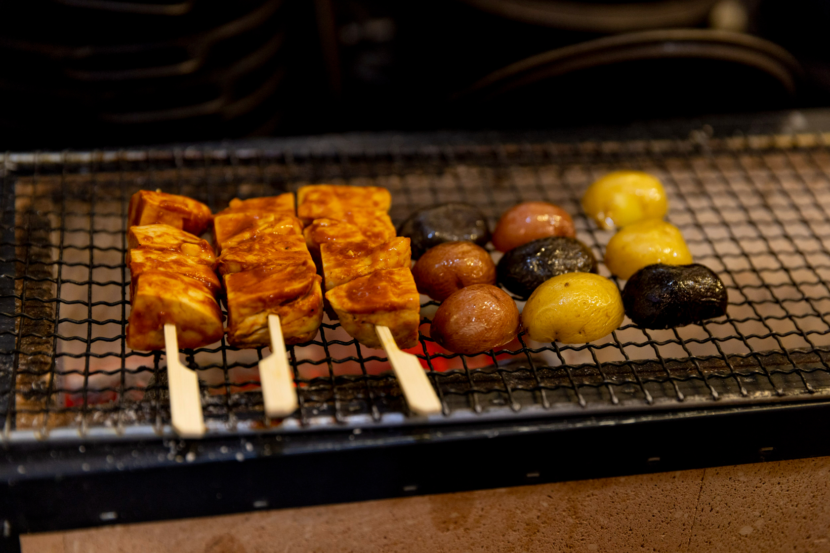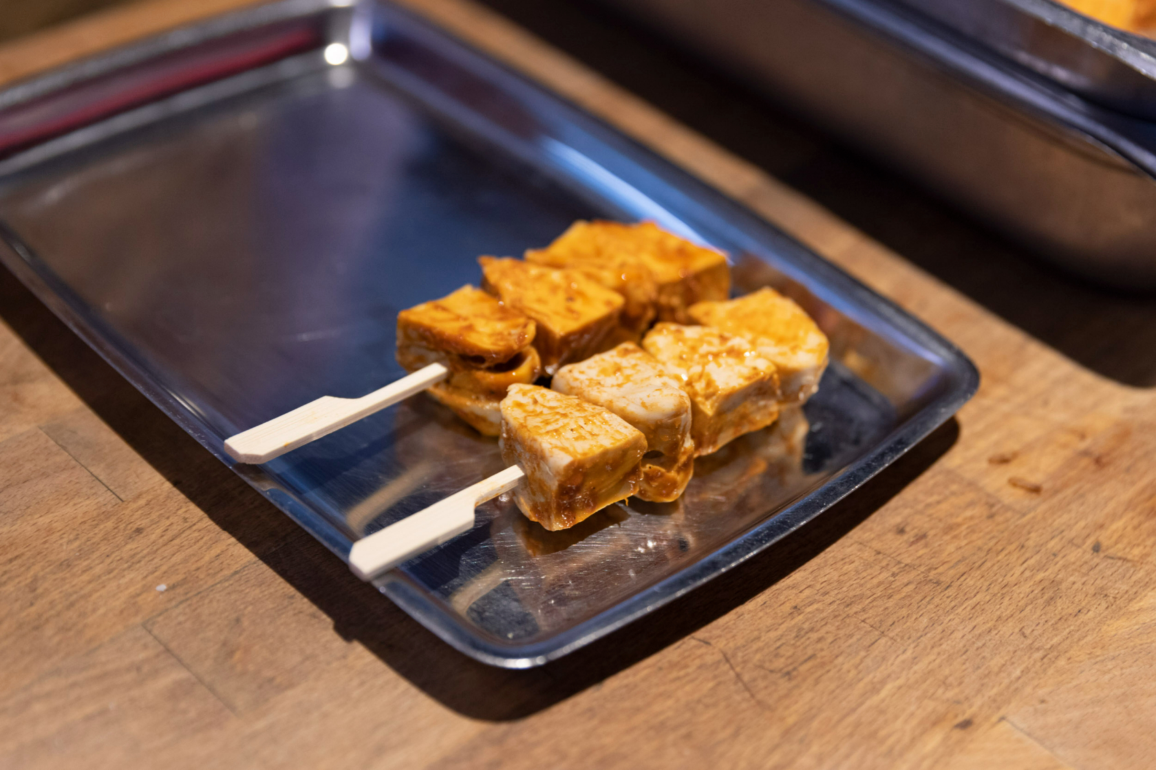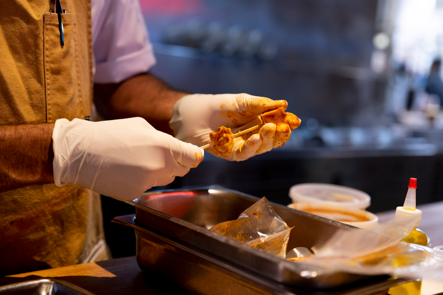 The dish may vary in flavor from traditional anticucho in another way, however; because their cooked chicken is only marinated for a few hours — not raw overnight, as customary — they may taste less of the spices, Lugo says.