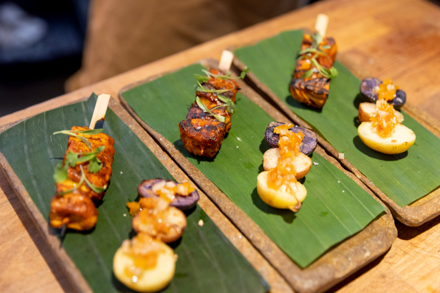 Seated by the window at the flashy restaurant, Latin music blaring, we wondered what the GOOD Meat chicken would taste like. Would it really resemble chicken? What does chicken even taste like? We didn’t have to wait long — the cultivated chicken skewers are the first dish to come out in the five-course tasting menu.