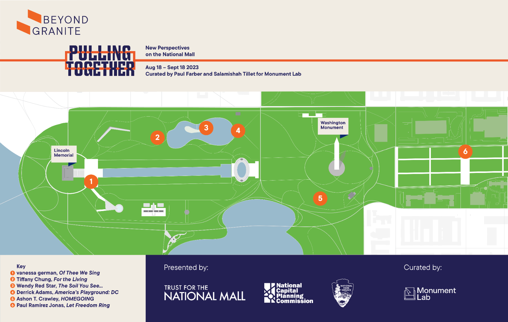 Beyond Granite is the Trust for the National Mall’s $4.5 million effort to create more inclusive and equitable monuments, in partnership with the National Capital Planning Commission and the National Park Service and with funding from the Mellon Foundation. Stretching from the Smithsonian Metro stop to the Lincoln Memorial, the installations include works from visual and performance artists including Ashon Crawley, vanessa german [the artist’s styling], Wendy Red Star, Tiffany Chung, Derrick Adams, and Paul Ramírez Jonas.