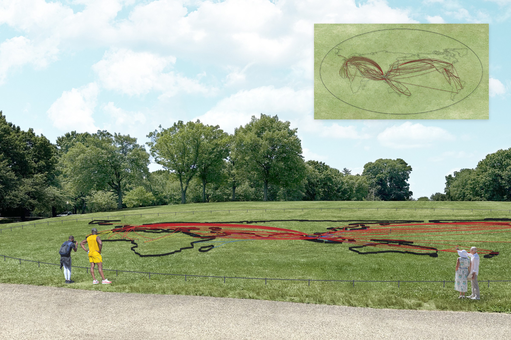 - For the Living by Tiffany Chung: A map displaying the global routes of Southeast Asian immigrants and refugees, located next to the Vietnam Veterans Memorial.