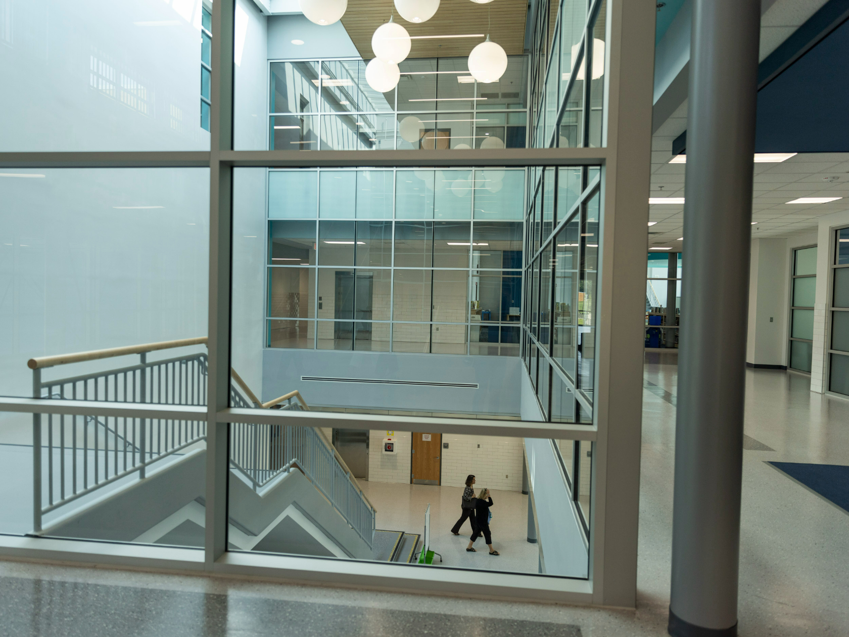 But the finished product, she thinks, is worth the wait. It’s full of natural light and cozy seating areas for small group learning. It smells new. A muralist is painting a “Falcons” mural in the gym, a nod to the school’s mascot, and next to the stairs between the first and second floor is a kind of natural amphitheater, with deeper steps for kids to sit on.