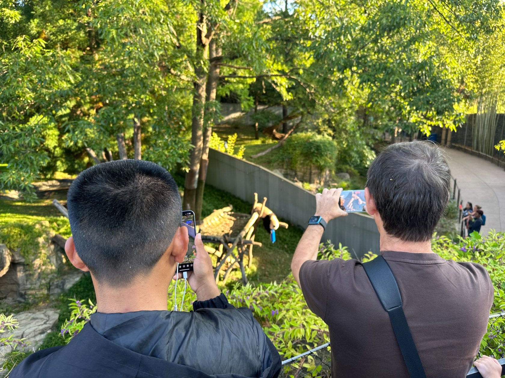 There’s a collective gasp from the two dozen people watching, filming, and taking photos of this adorable creature. But the panda takes it in stride, slowly climbing down the structure and pouncing on the toy once again. Everyone in the crowd cheers.