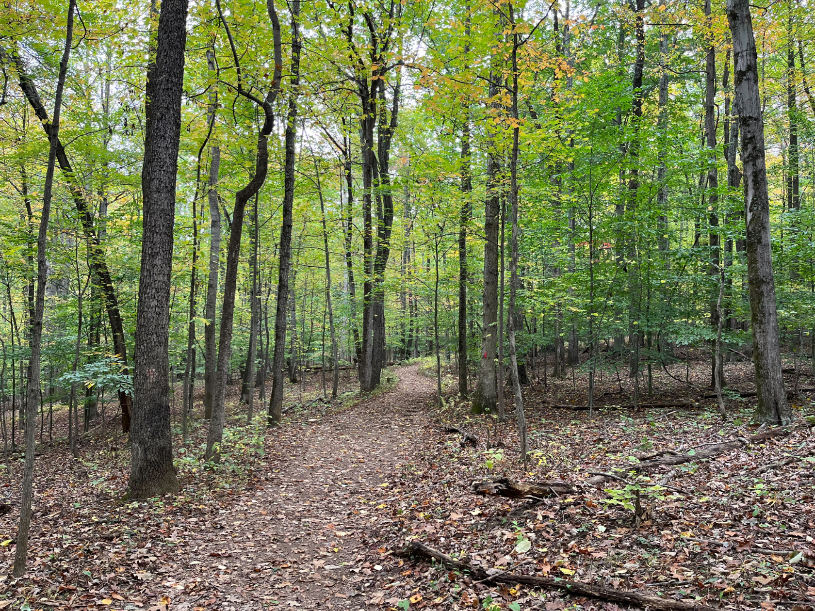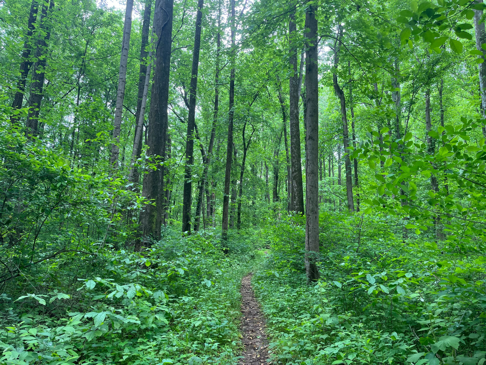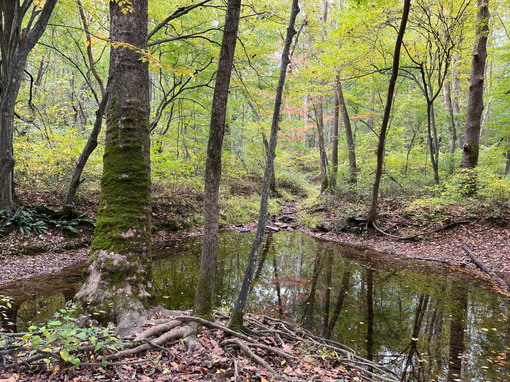 We pause as the trail enters an older stretch forest with mature maple, beech, poplar, and oak trees so tall and straight that you have to crane your neck to look at the canopy. The tangled undergrowth of the newer forest near Piney Run is gone, and you can see the contours of the hillside angling down towards a wetland area. At one point in the mid-1900s, the wetland was a man-made pond which narrowly escaped becoming a water feature on a proposed golf course development.