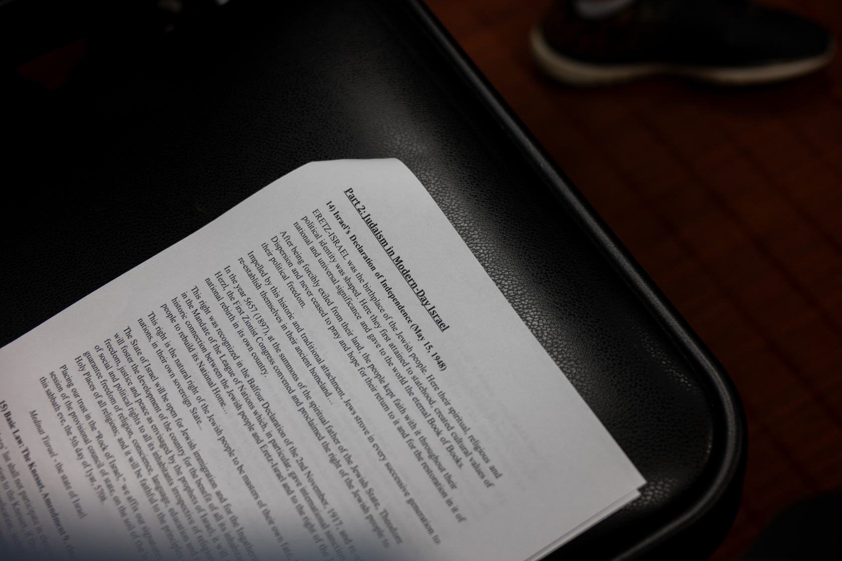 Nearly every seat in the room was filled by regulars and others looking for context as Potek explained the history of Israel through a number of sources – including a 19th century writing from Rabbi Samson Raphael Hirsch on Exodus 22:20, which argued that establishing the state of Israel is conditional.