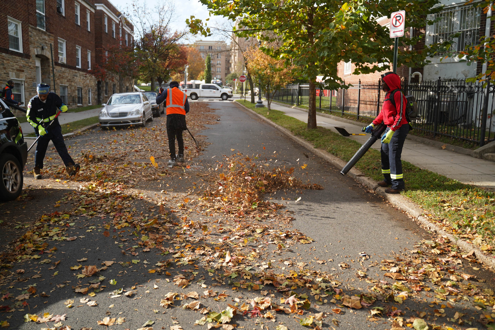 On the first morning of the new leaf collection regime, a crew got started on a street in Columbia Heights, where sidewalks were covered with bright orange and red maple leaves. Using rakes and electric leaf blowers, workers pushed leaves into the street, then a truck towing a giant leaf vacuum passed by, sucking up the line of leaves. It was efficiently executed. It was also relatively quiet and free of air pollution, thanks to D.C.’s gas-powered leaf blower ban that went into effect last year.
