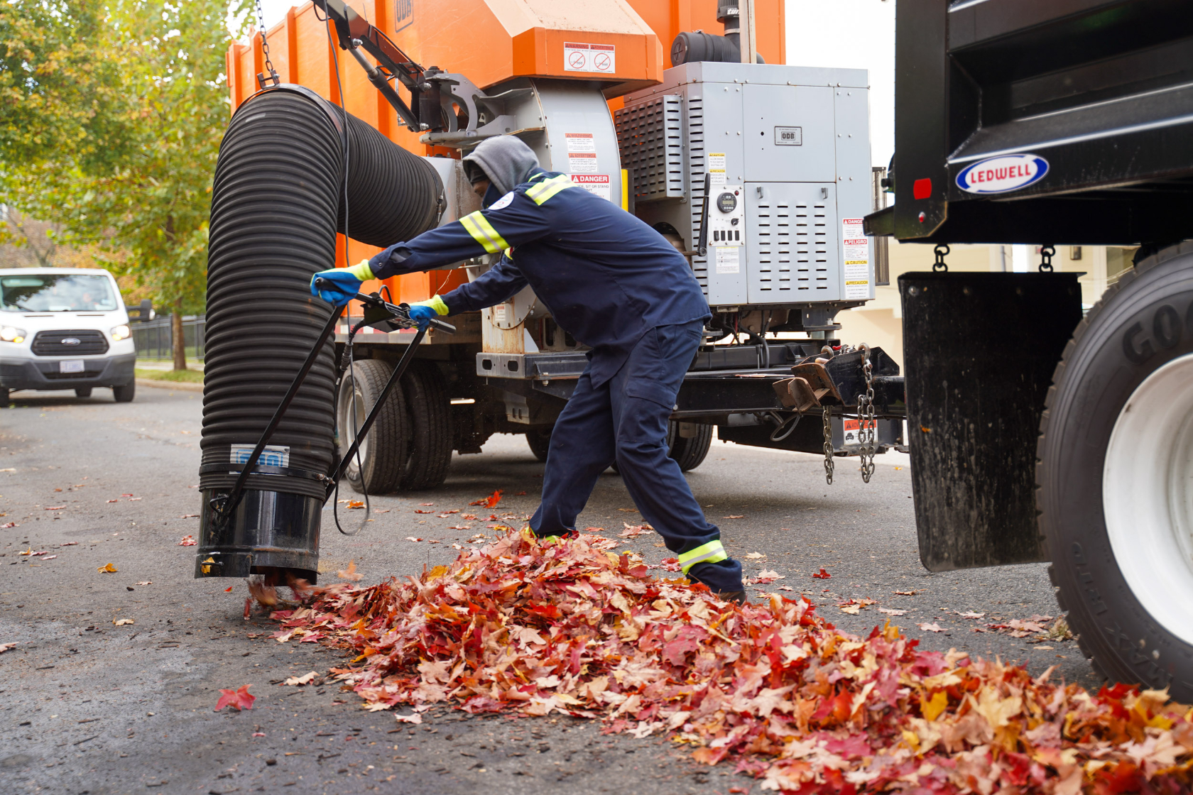 DPW has 250 workers assigned to leaf collection this year, split into 11 crews. They have 100 battery-powered leaf blowers and 44 giant leaf vacs. After they are collected, the leaves are trucked out of the District to be composted.