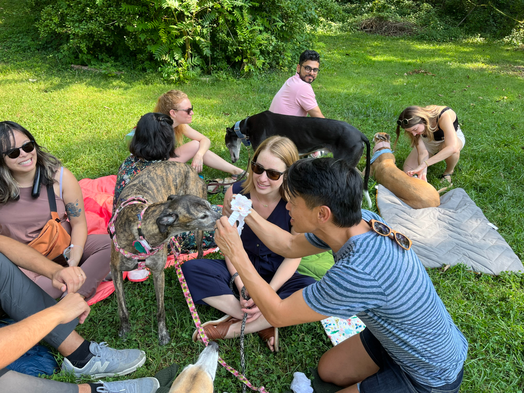 Their owners sat on blankets, chatted, and ate snacks. The most audible excitement came when Martin gifted Napa — the only girl sibling, described by her neighbor Hannah Catlow as “a little queen” — a homemade collar that had large white flowers on it.