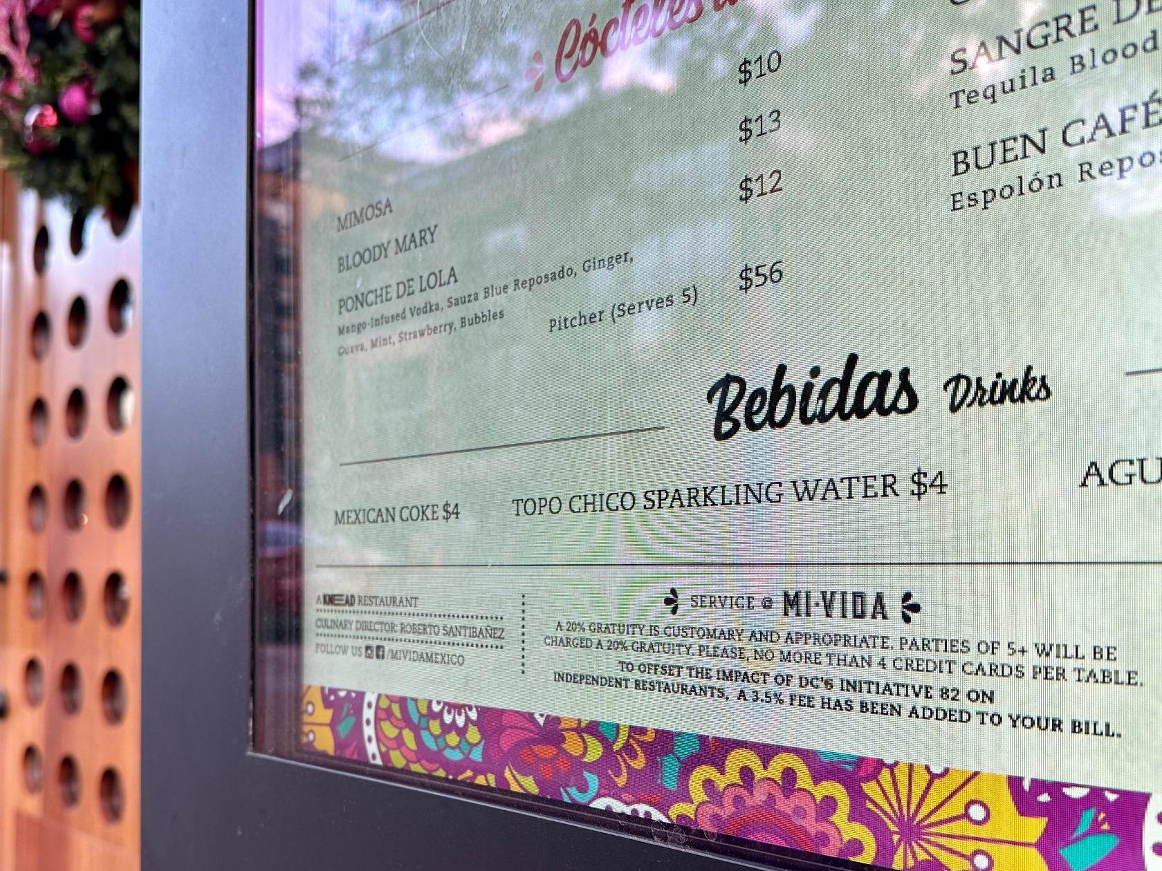 “To offset the impact of DC’s Initiative 82 on independent restaurants, a 3.5% fee has been added to your bill,” local Mexican chain Mi Vida says on its menu.