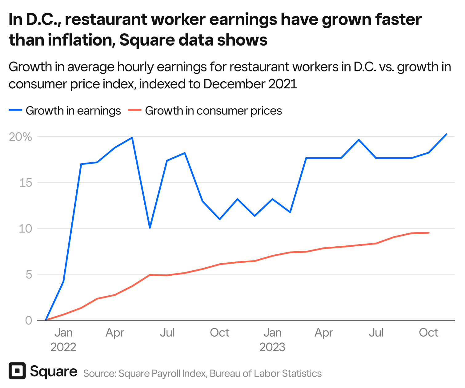 Conversations with front-of-house restaurant workers during the past month reflect the dichotomy in the Square data. Of more than a dozen workers DCist/WAMU spoke to, several said they make more money now — though the pressures of inflation and many restaurants’ new service charges mean that hasn’t been the case for everyone.
