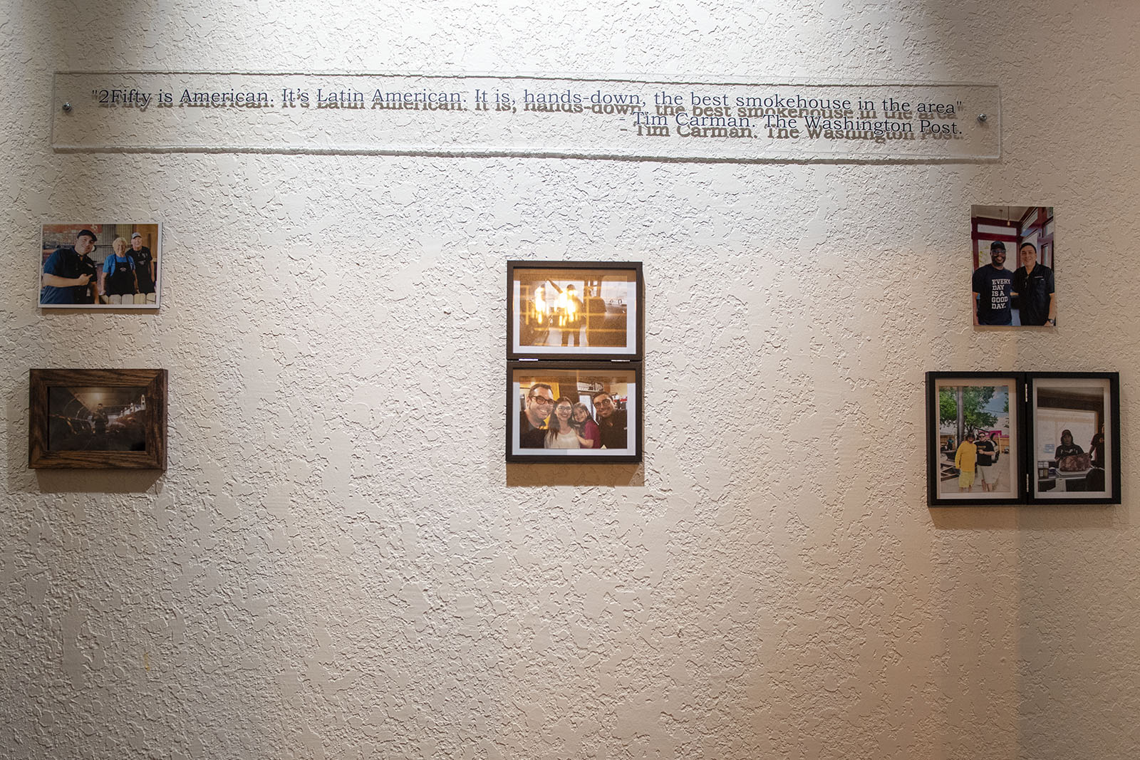 The new restaurant’s decor is manifestation of 2Fifty: a celebration of wood (from the hardwood floors to tables), Texas (wall memorabilia includes photos of the pitmaster and his Texas mentors), and meat (a butcher block countertop, where the pitmaster can be seen chopping meat in front of customers).