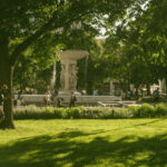 Two women in their 30s are walking by Kalorama Park. One woman to the other:
