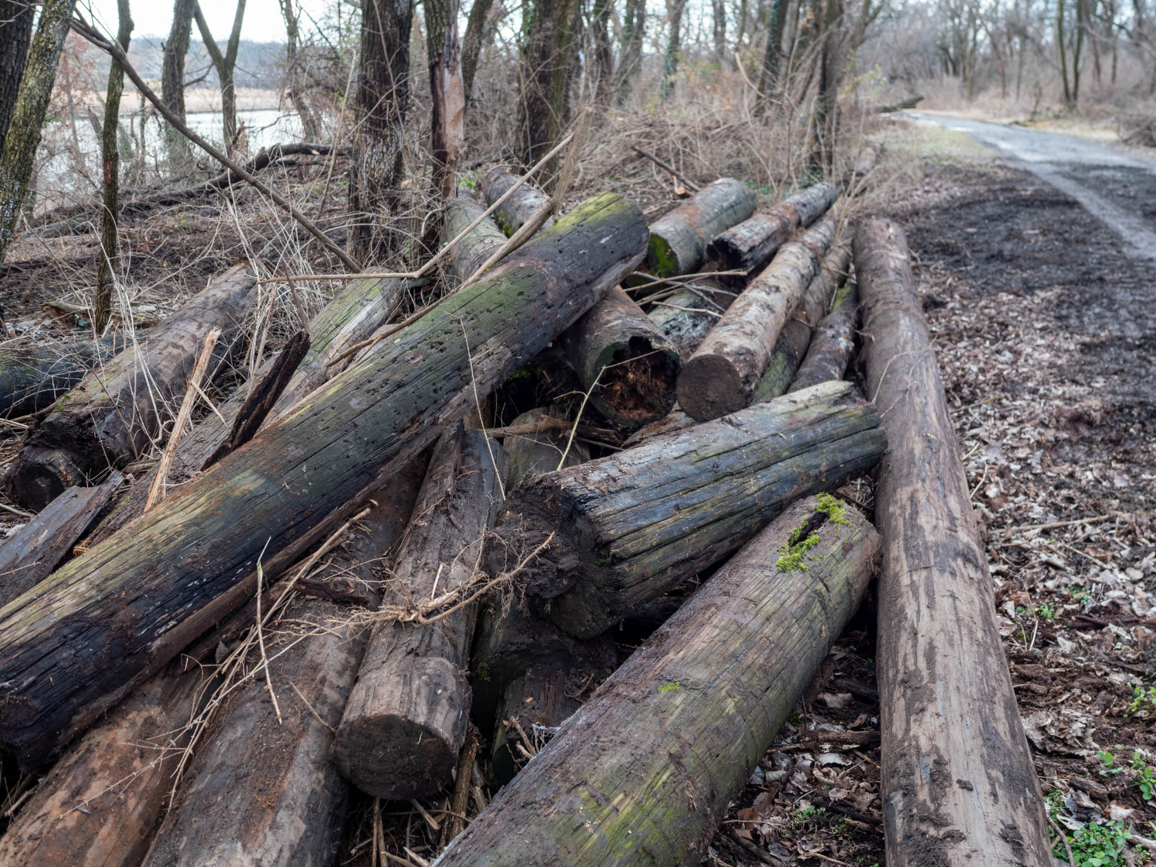 The biggest category of debris that’s being removed is creosote-soaked telephone poles. There are between 60 and 90 of them, stacked in piles hidden among the trees. You might easily mistake them for downed trees, until you get close and smell the toxic creosote.