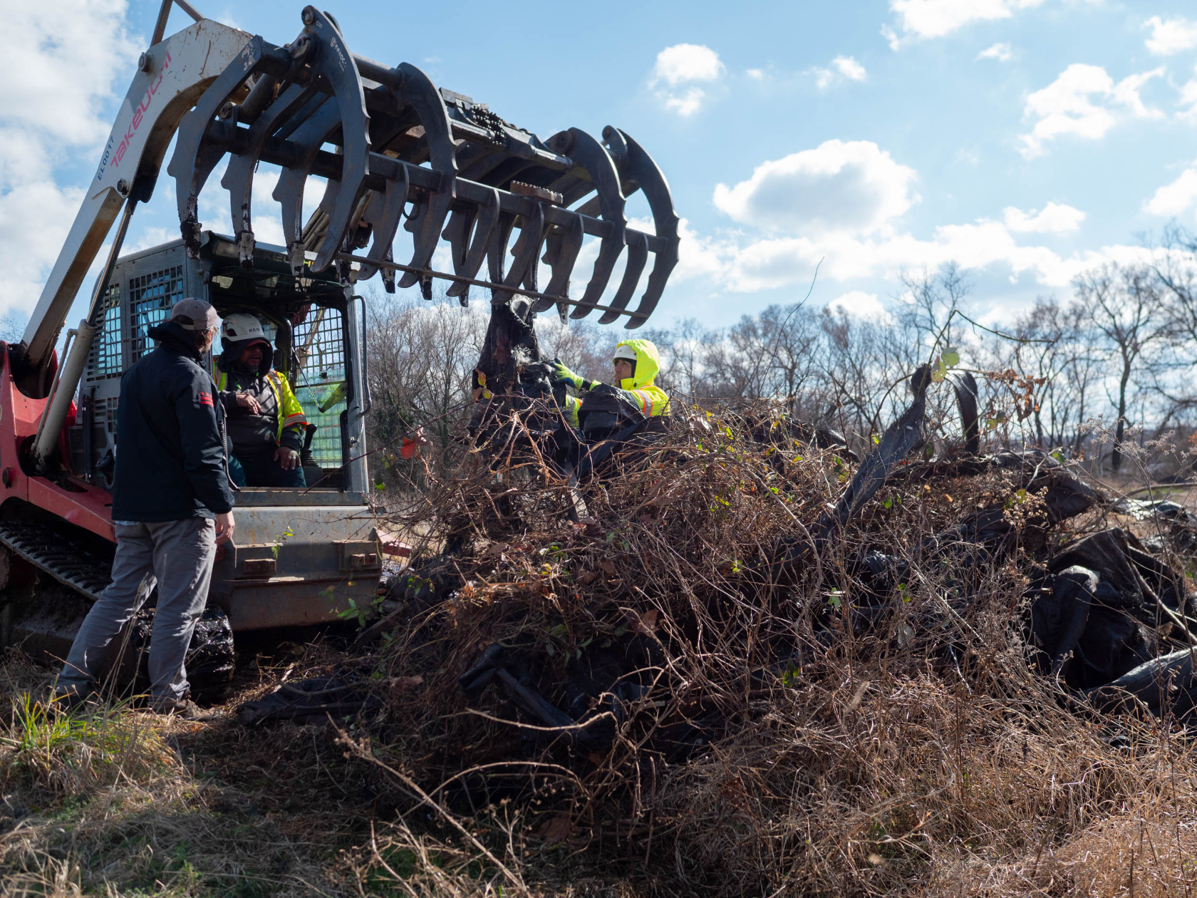 The biggest category of debris that’s being removed is creosote-soaked telephone poles. There are between 60 and 90 of them, stacked in piles hidden among the trees. You might easily mistake them for downed trees, until you get close and smell the toxic creosote.