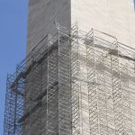 The covering on the Washington Monument is nearly complete, clearing the way for the stonework to begin.