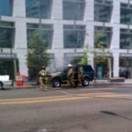 We got several tips about a car catching fire on 17th Street NW near K, right by Farragut Square a little while ago. Reader Brett Andriesen was kind enough to send in this image from his phone – looks like the fire department already has the situation under control. Hope that wasn’t your green SUV (looks like an Explorer maybe?)….