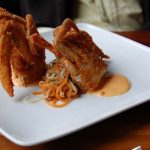 It has been soft shell crab season for a few weeks now. Most of them are coming up from North Carolina at present, but the Maryland ones should be in season soon. One of the best versions around town is at Proof. Chef Haidar Karoum serves them fried with a cucumber slaw and a creamy chili garlic dressing. Karoum has a great ability to seamlessly adapt Asian flavors into more modern interpretations without making them seem kitschy or hackneyed. This dish is a perfect example. The cucumber slaw is a quick sweet pickle with jalapeno reminiscent of the pickled vegetables found on banh mi sandwiches. The dressing hints at sriracha. With a nice French baguette, this dish would make a superlative banh mi.