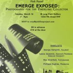 While you can still stroll through the DCist Exposed Photography Show anytime during Long View Gallery’s regular hours until March 21, we still have one more big event before the show closes. Pink Line Project’s fantastic Emerge Exposed: Photography for the Emerging Collector panel discussion is back for its third year, featuring three great people from the local art community who will discuss that other side of the art exhibit: purchasing a piece for…