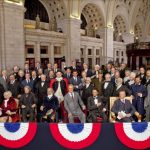 Here at DCist, we’re always happy to pass along publicity stunts which dabble in the surreal. That said, we were excited to see this image, taken yesterday inside Union Station’s Grand Atrium, land in our inbox last night. Wax figures of all 44 presidents (click here to see a high-res version) were set up to promote Madame Tussauds‘ soon-to-open U.S. Presidents Gallery — “the only place in the world where people can see and interact with all 44 U.S. Presidents.” (How many can you name without cheating?) It’s also nice to know that Lyndon Johnson’s wax figure continues to smash the Unintentional Comedy scale — Johnson’s sullen facial expression and positioning behind the rest of the group makes it look like he’s just photobombing the whole thing on his way to catch the train to New Carrollton.
