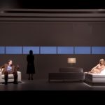 Watching the Shakepeare Theatre’s new production of Harold Pinter’s Old Times is a little like watching a life-size shoebox diorama. Designer Walt Spangler’s set, lit with a cinematic eye by Scott Zielinski, turns the stage of the Lansburgh Theatre into a rigidly-defined rectangle, with white walls, ceiling, and floor, white modernist furnishings, and a long row of rectangular windows at the back meant to look at the sea beyond the walls of this remote English country house. It’s cold, sterile, and more enclosed than one is used to seeing at the theater, and heightens the voyeuristic sense of peering in on a carefully constructed moment in the lives of its characters.